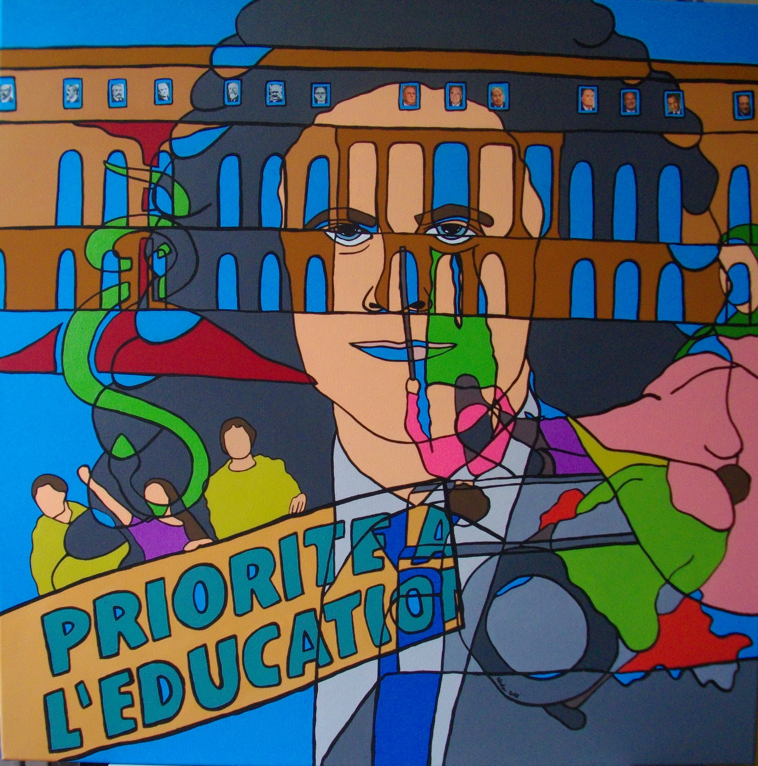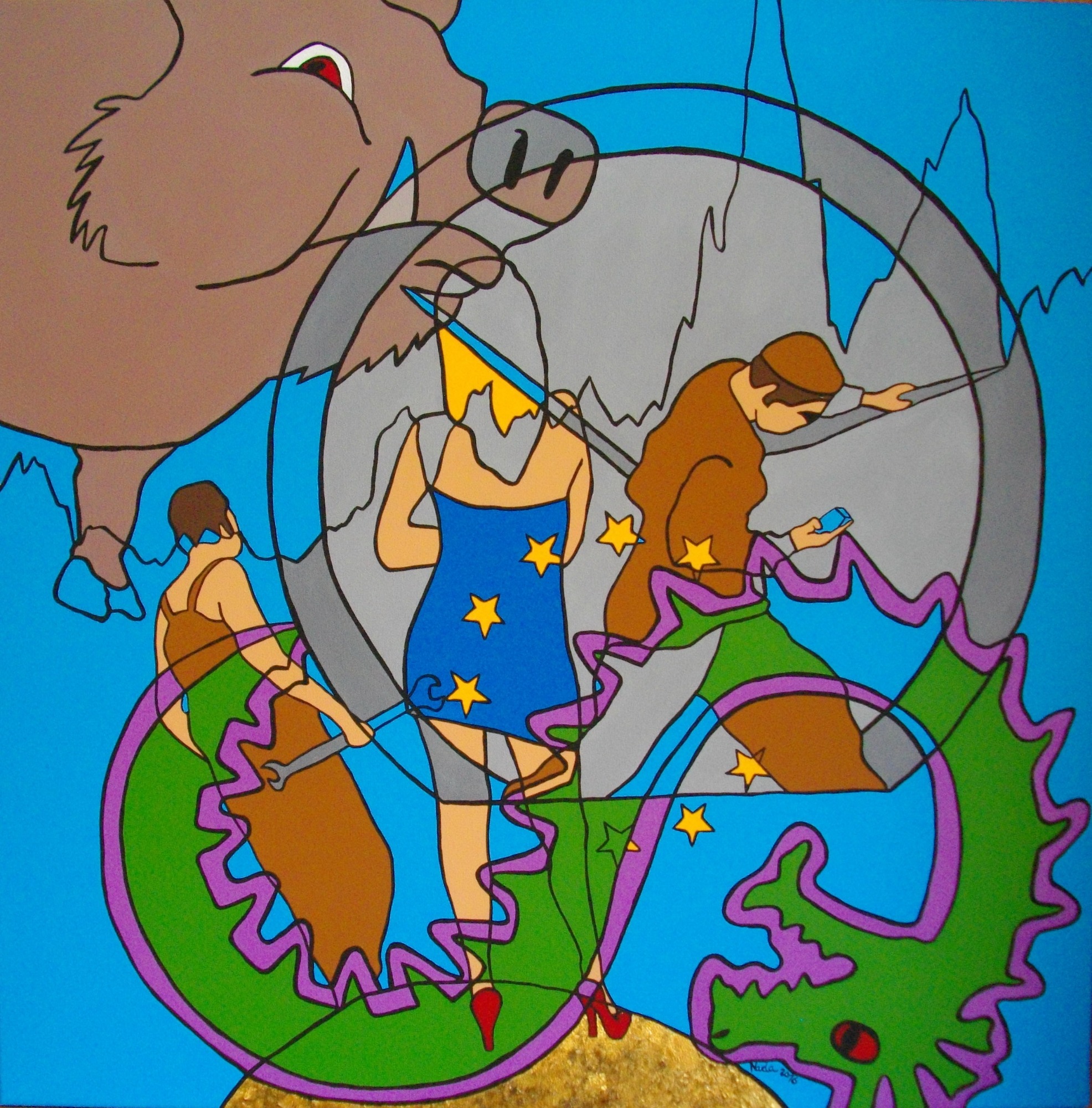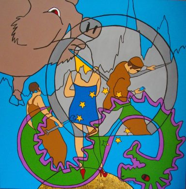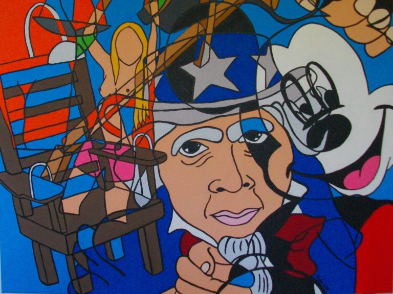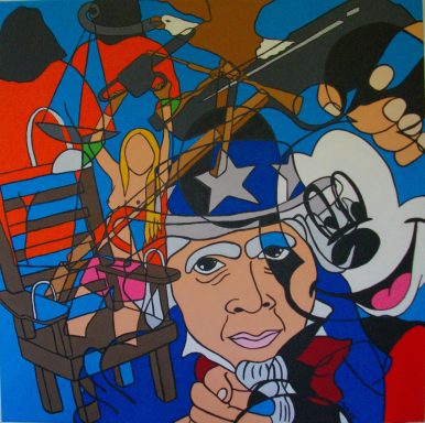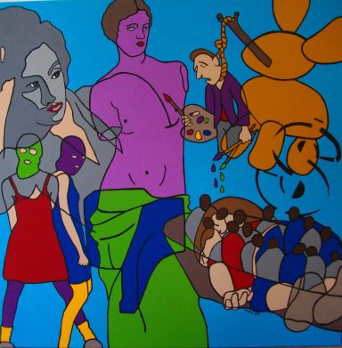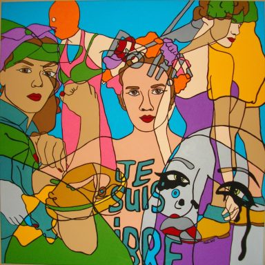 Série intitulée « Dark Side of the World ». Ce travail, d’ordre social et sociopolitique, s’articule autour de la société dans sa complexité et a pour fonction d’agir sur le comportement social. Il donne à réfléchir et à voir ce que nous sommes et comment la société nous influence. Ce fil conducteur, “la société” permet d’explorer les mécanismes internes de l’individu en se laissant guider par ce qui interpelle, ce qui touche de près ou de loin, ce qui tourmente. Il s’agit de bousculer notre vision du monde, de déranger, de mettre le doigt sur les perversions et l’oppression par le pouvoir de l’art, qui est de se situer là où la perception de la réalité semble devoir faire l’objet d’un réajustement.