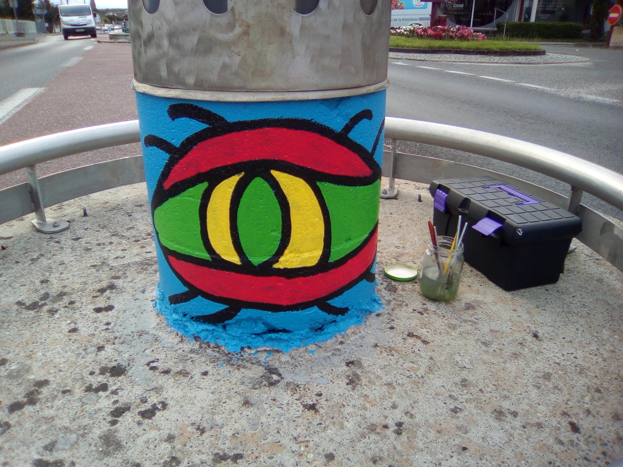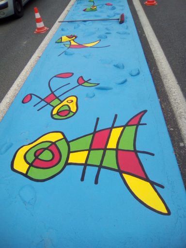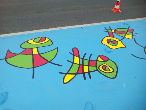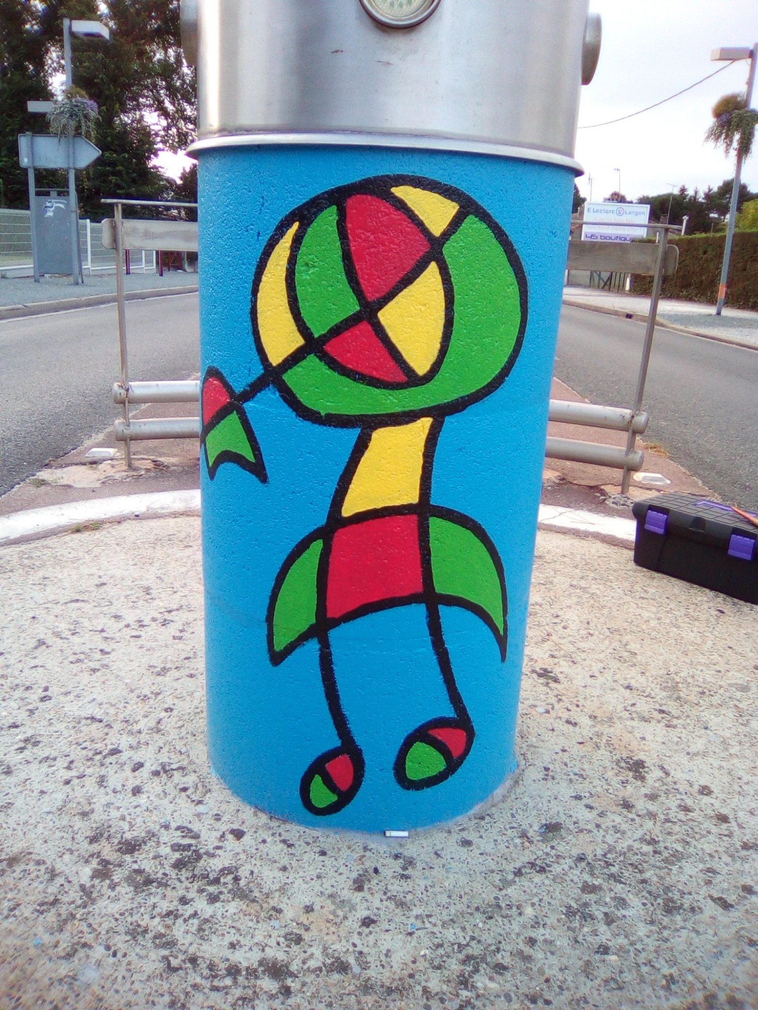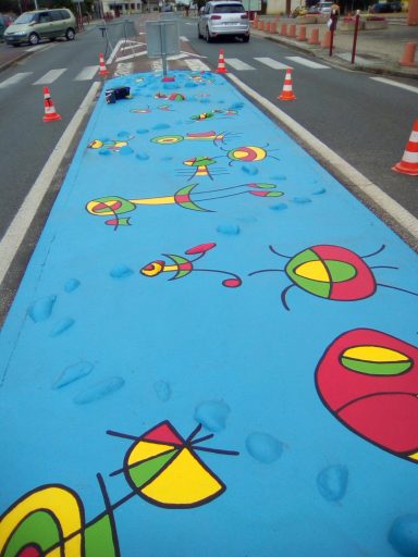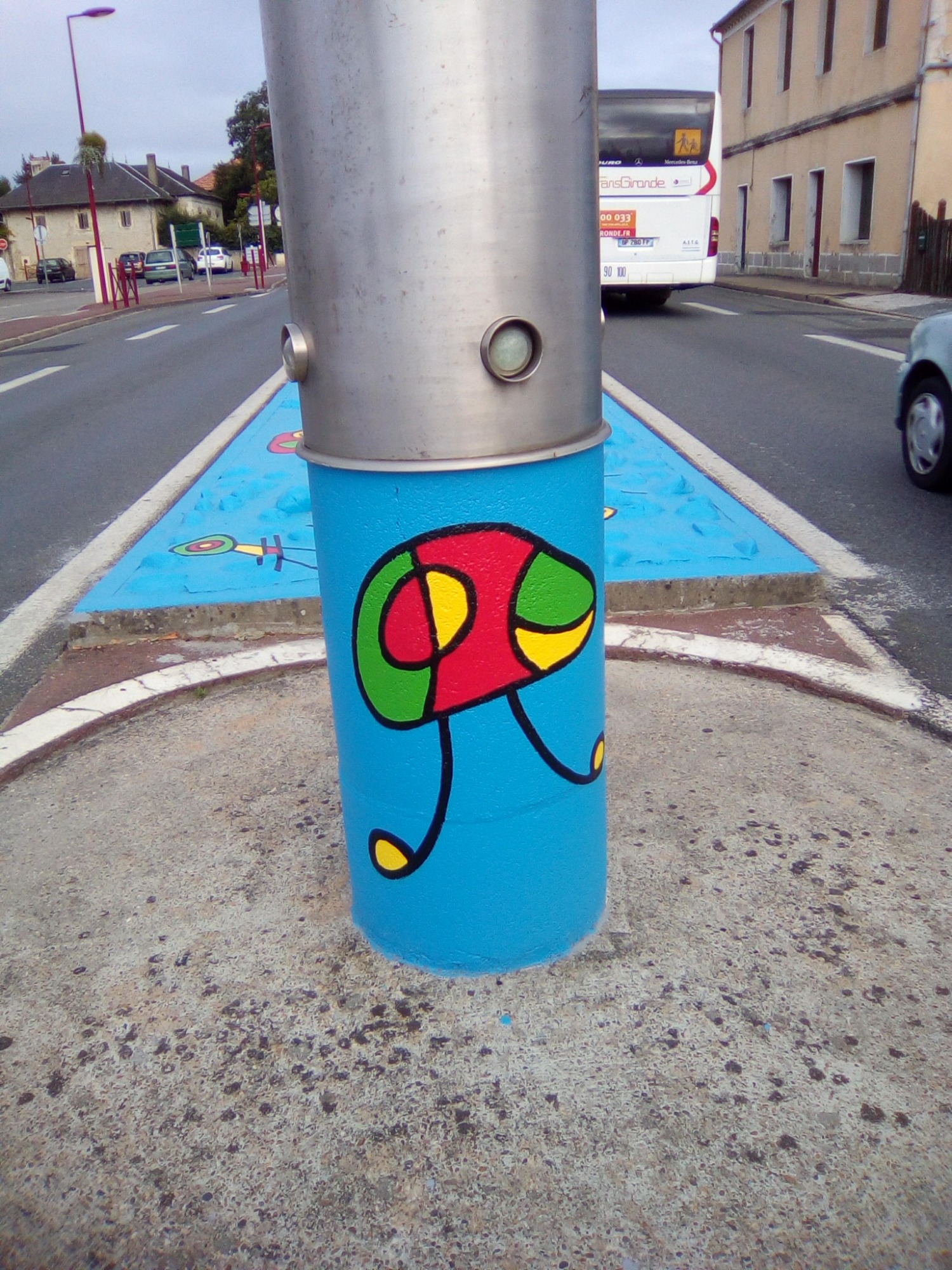Ce projet a été réalisé en 2017 dans le but d'égayer et de dynamiser le centre-ville de la commune de Toulenne. Il s'agissait de mettre en valeur par la couleur ce petit bout de bourg. J'ai donc naturellement choisi un graphisme d'inspiration Miro, afin de marquer le dynamisme de notre commune. Le choix des couleurs s'est porté sur le bleu, rouge, jaune et vert en lien avec les couleurs de Miro mais aussi du logo de la commune. Également, ces couleurs sont un clin d'œil à notre région : le rouge pour le vin, le vert pour la forêt, le jaune pour le soleil et le bleu pour l'océan.