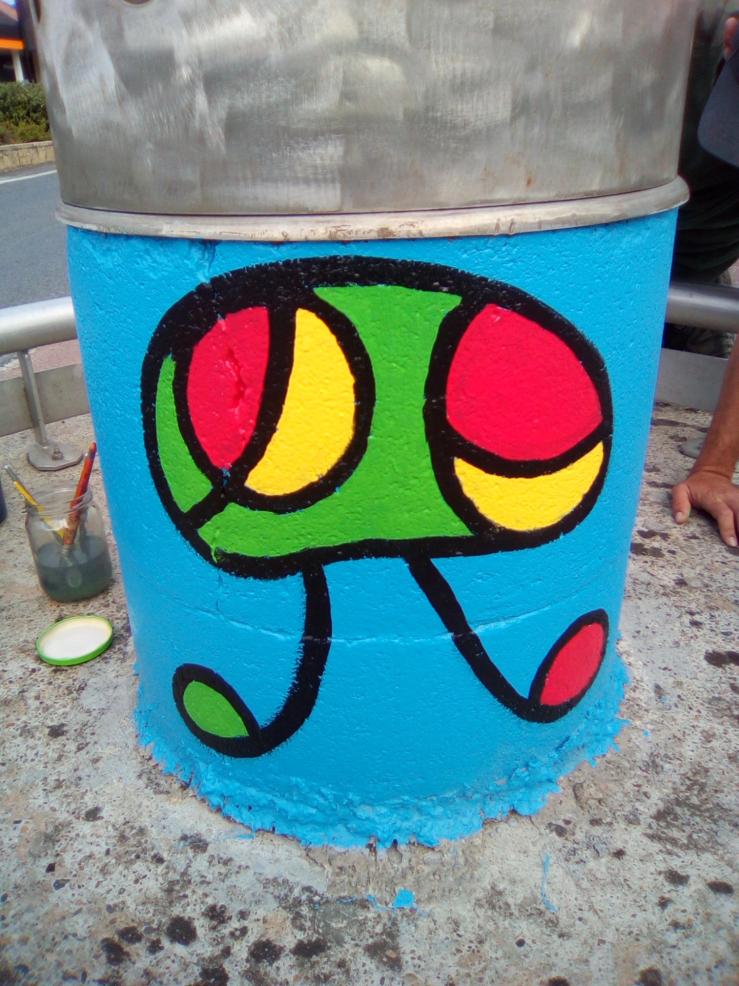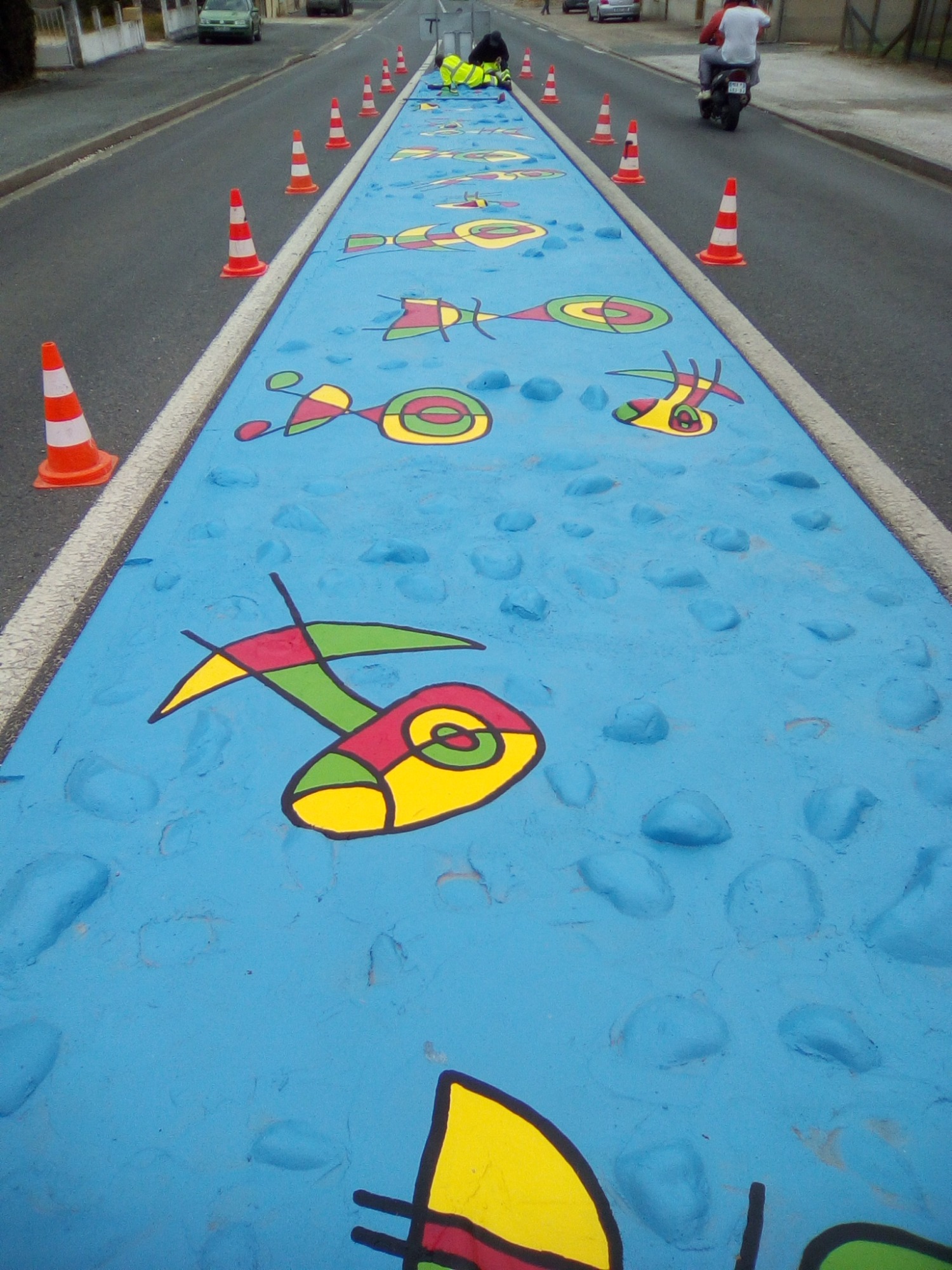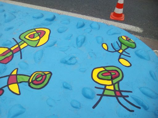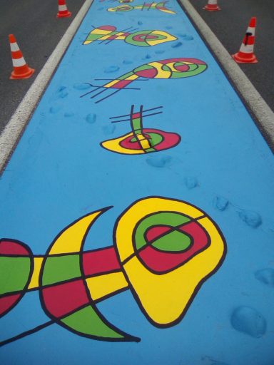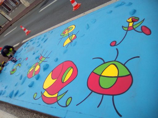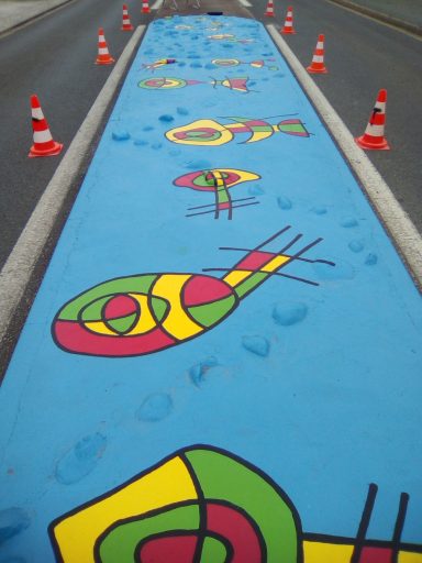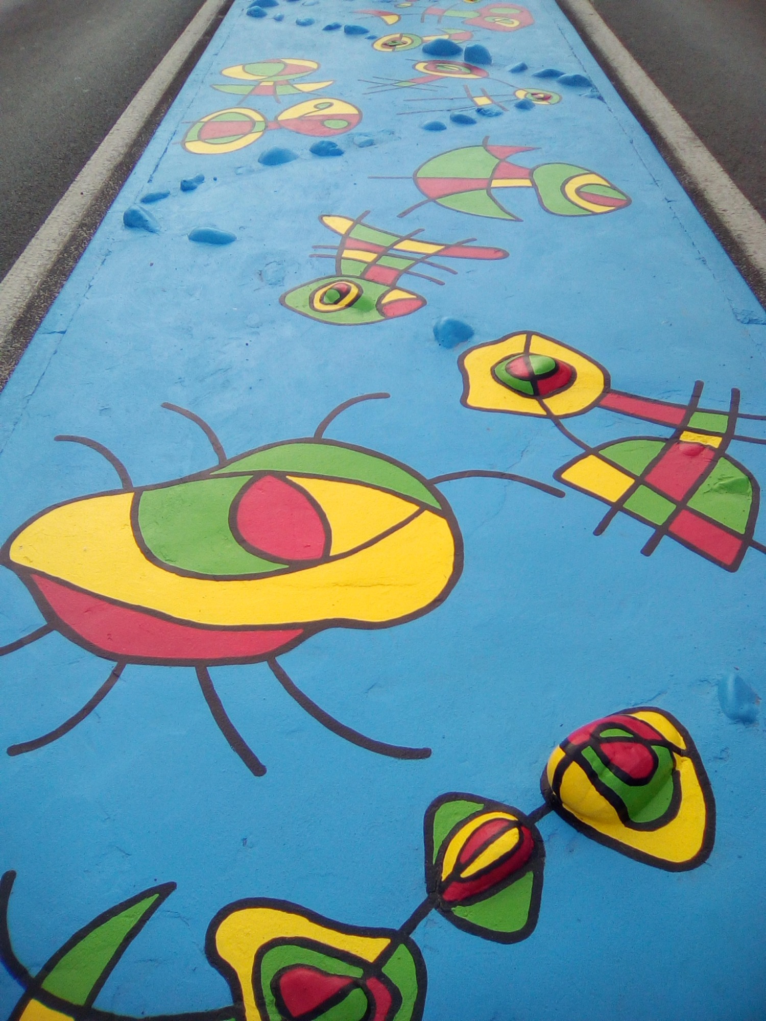 Ce projet a été réalisé en 2017 dans le but d'égayer et de dynamiser le centre-ville de la commune de Toulenne. Il s'agissait de mettre en valeur par la couleur ce petit bout de bourg. J'ai donc naturellement choisi un graphisme d'inspiration Miro, afin de marquer le dynamisme de notre commune. Le choix des couleurs s'est porté sur le bleu, rouge, jaune et vert en lien avec les couleurs de Miro mais aussi du logo de la commune. Également, ces couleurs sont un clin d'œil à notre région : le rouge pour le vin, le vert pour la forêt, le jaune pour le soleil et le bleu pour l'océan.